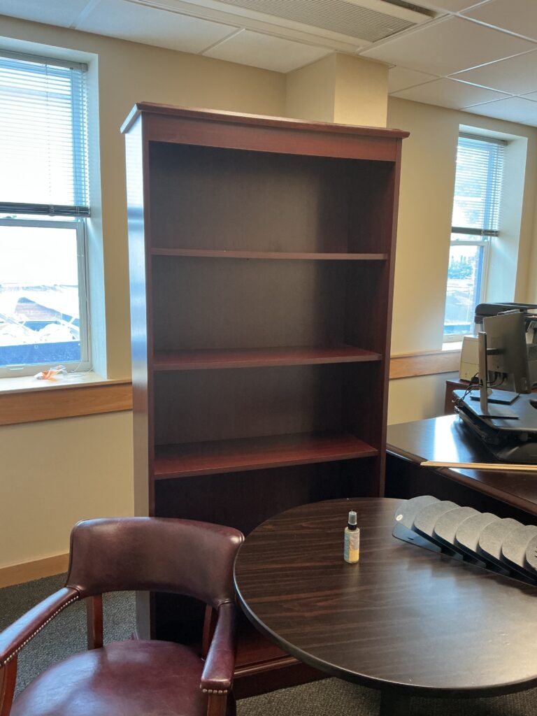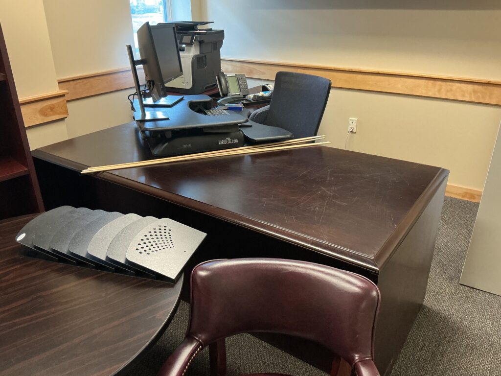 For all of the following materials, please contact Dustin Thompson (dthompson9@une.edu) to request the item. Dustin will let you know if it is still available and then ask you to place a workorder for the item and where you want it relocated to within the university. Dimensions and current location are in captions or on photos – please be descriptive or include a screenshot to identify which piece you are interested in.