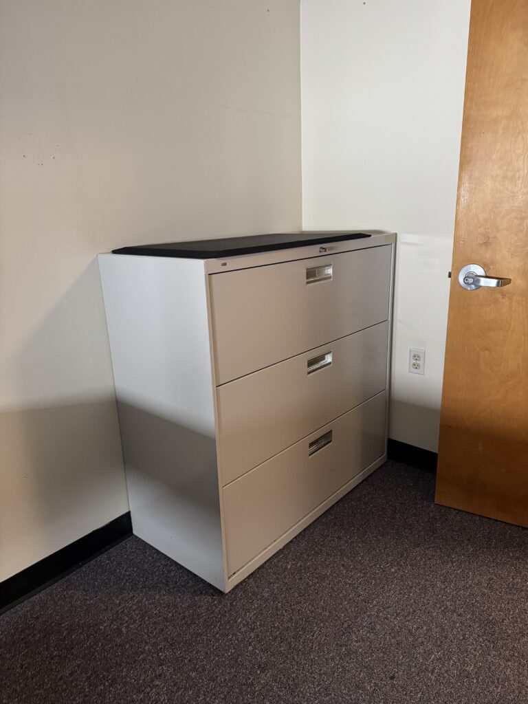 Three drawer legal filing cabinet is 29.5″ wide x 39″ tall x 19.5″ deep.