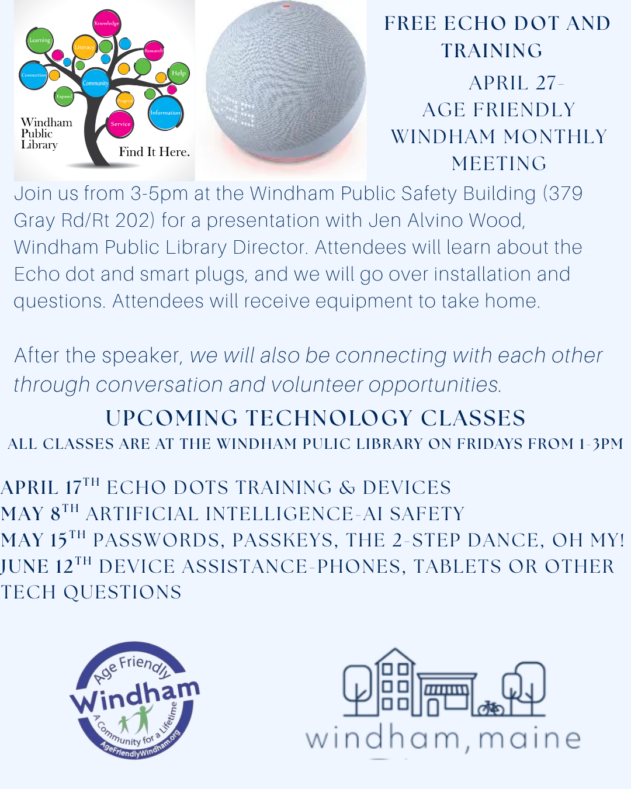 Age-Friendly Windham and the Windham Public Library are hosting an upcoming Echo Dot Training.