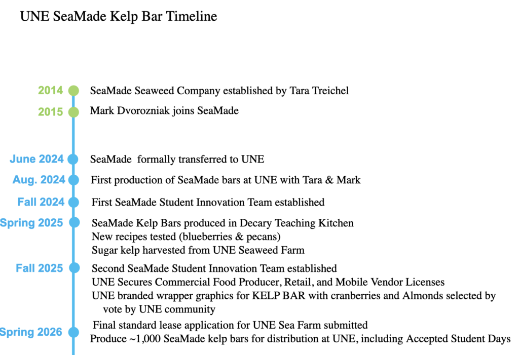 In 2023 SeaMade co-owners Tara Treichel and Mark Dvorozniak met UNE Associate Professor Carrie Byron during a Maine Seaweed week event in Portland, Maine. After talking with Dr. Byron, who studies regenerative seaweed aquaculture, the SeaMade co-owners decided to explore donating the company to the University of New England (UNE) to help it remain a viable business focused on sustainability as well as providing an innovative pedagogical tool for educating the next generation of entrepreneurs.