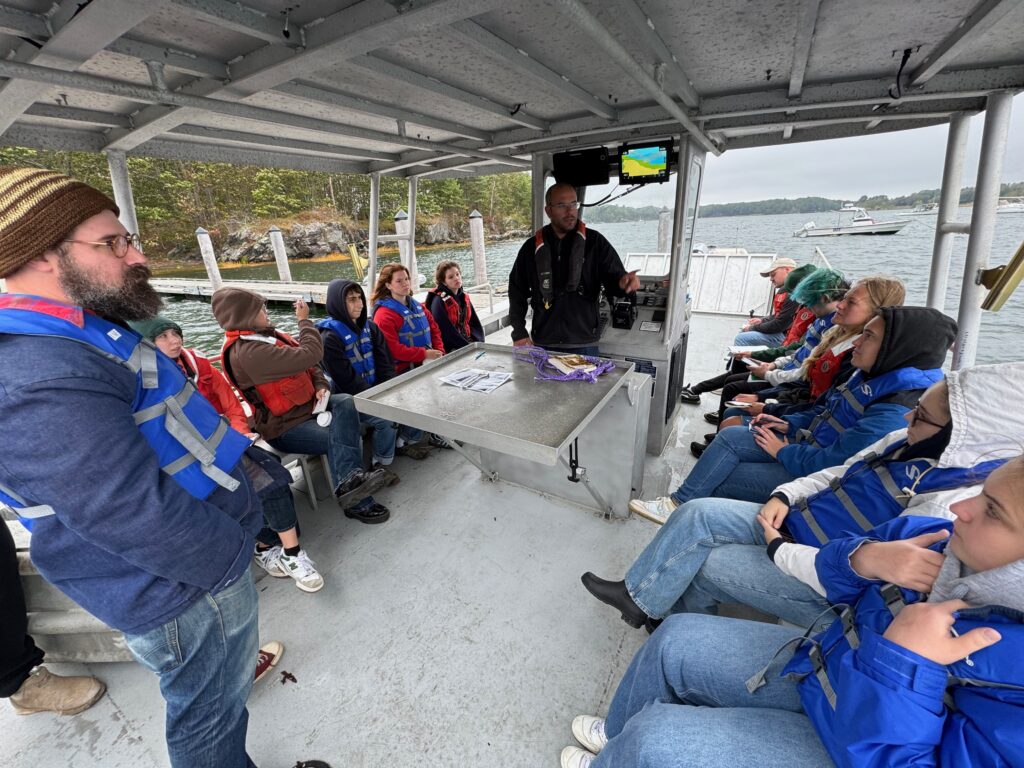 Chris spun the boat around and approached the first card. He slowed the motor. At the same time, the students and I dangled Prof. Arthur Anderson off the side of the boat. It may not have been glamorous, but it did the trick. Arthur quickly saved our early map.