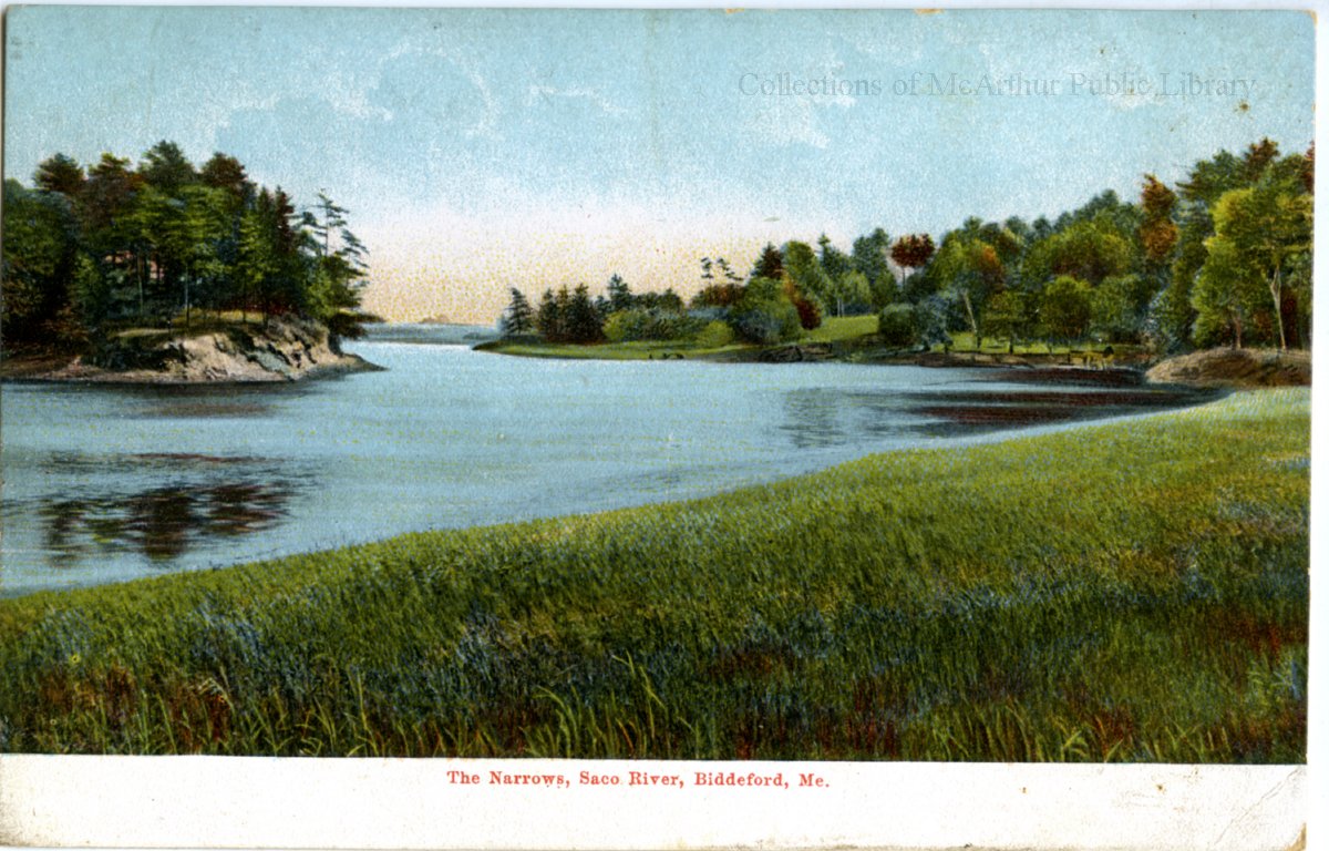The Narrows, Saco River. We studied this spot quite carefully because a ferry once passed from the rocky side on the left over to the Camp Ellis side on the right. The foreground of the image appears to be marsh. Today it is two private homes and looks quite different. (Image courtesy of McArthur Library, Biddeford, Maine)